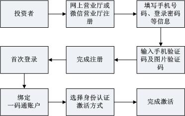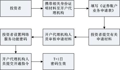 已開證券賬戶的投資者可攜帶有效身份證明文件直接至與其具有委托交易關系的開戶代理機構或開立相關證券賬戶的原開戶代理機構,申請通過統一賬戶平臺提交網絡用戶開通指令的方式辦理身份認證,開通指令提交后次日投資者方可使用其證券賬戶號及開通時設置的初始密碼登錄本公司網站辦理查詢、投票等業務。主要流程如下: