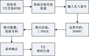 交易時間內,投資者使用上述證券賬戶通過證券公司自助交易平臺(如交易軟件、電話委托交易系統等)以買入指令的方式,輸入證券代碼(369991)、購買價格(密碼激活為1.000元,密碼重置為2.000元)、委托數量(收到的校驗號碼)后,將買入指令提交至證券公司。圖示如下: